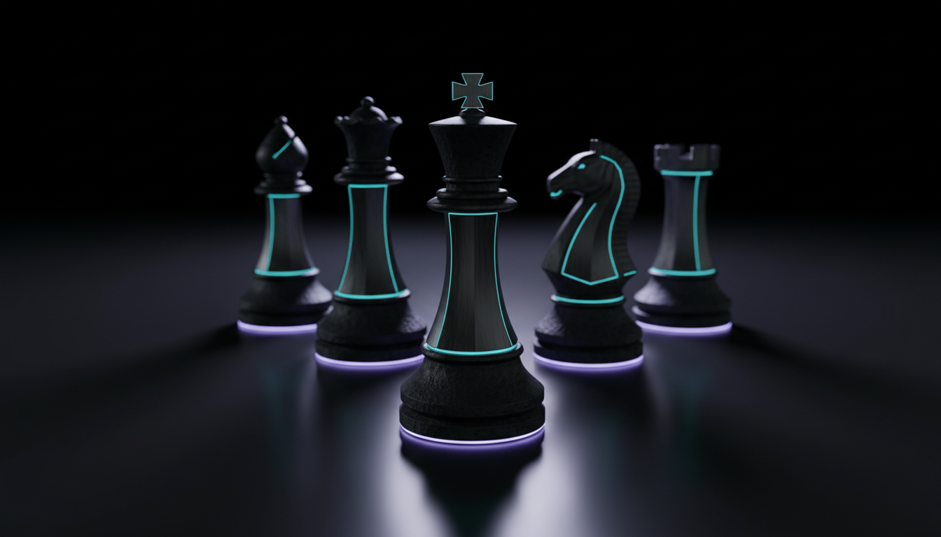 Cinematic, ultra-realistic 3D render: five modern, monolithic chess pieces in matte black obsidian and brushed tungsten form