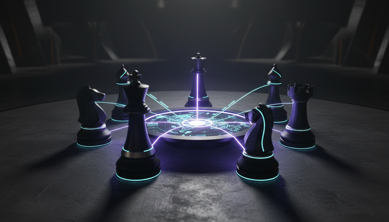 A cinematic, ultra-realistic 3D render of five modern, monolithic chess pieces standing around a circular map-table whose gla